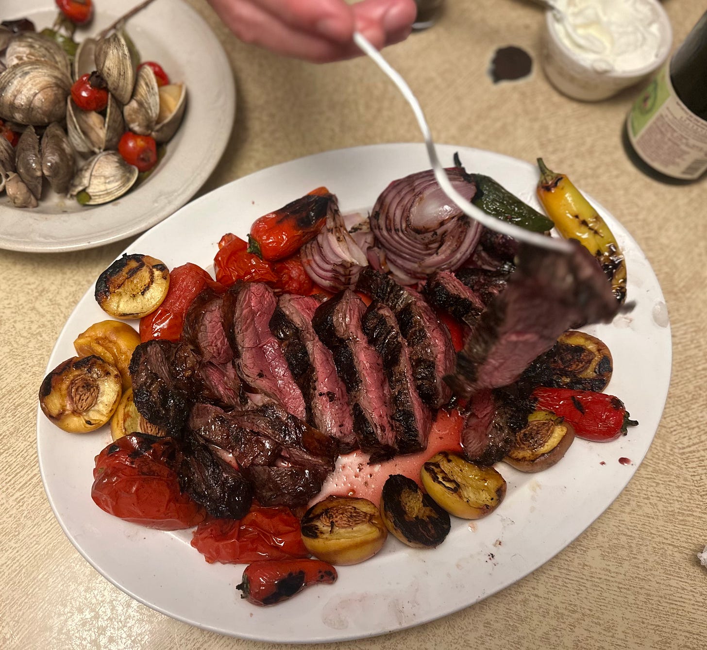 Mom wanted a fatty steak for our last family meal at the beach house so I grilled a hanger steak, vegetables, and peaches with a side of grilled clams and rosehips. As much as I love wild game, it’s hard to beat a hanger steak. When I’m cooking at the beach, it’s easy to incorporate wild foods into almost any meal in small, natural ways - I just throw a little seaweed, rosehips, sea rocket, bay leaves, or shellfish in it.