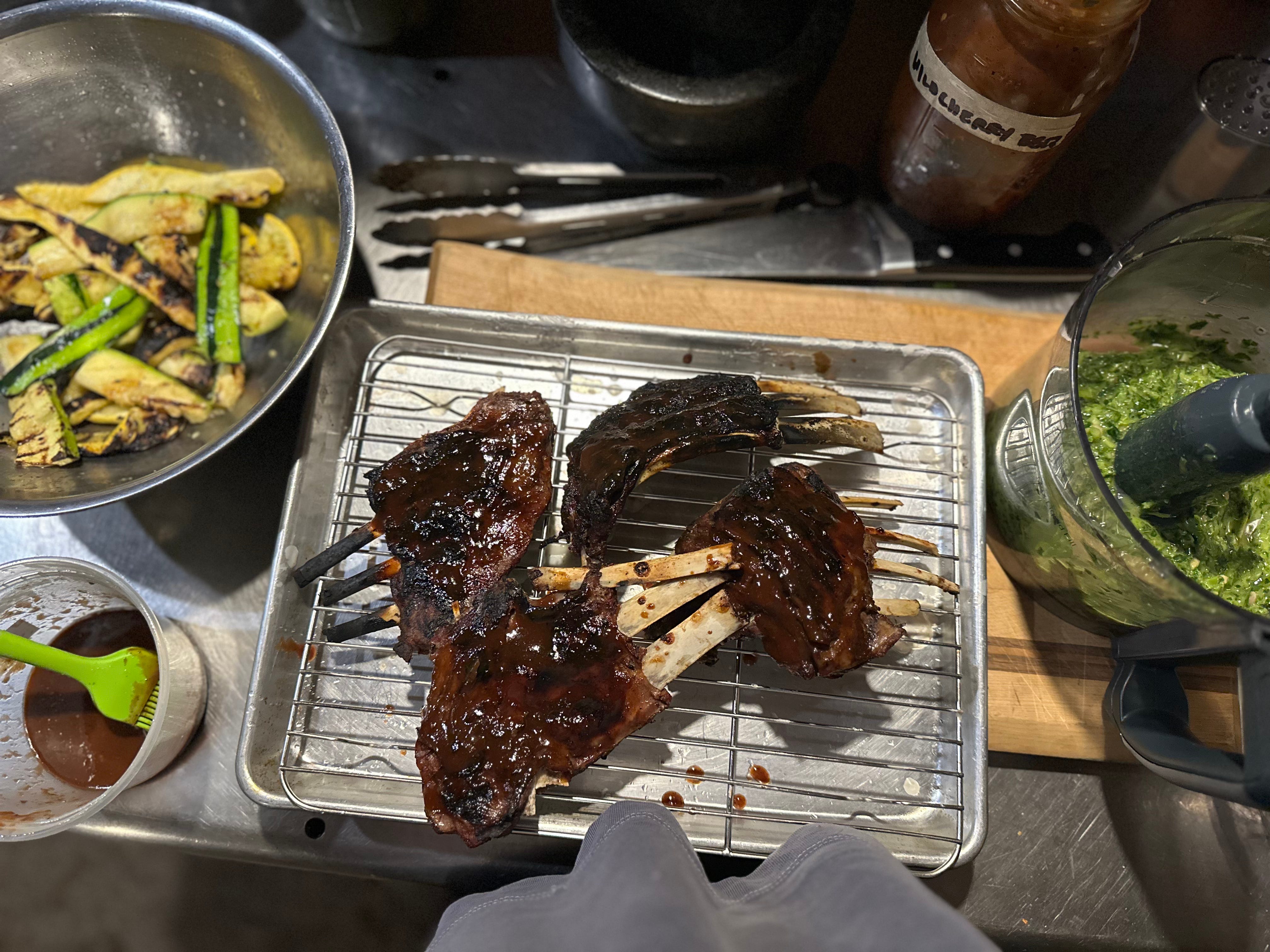 Whitetail ribs in wild cherry barbecue sauce. Grilled vegetables and wild herb green sauce for company. Whitetail ribs are often boned out for the grind pile, which is fine, but I like to keep them on the bone for when I have a hankering for barbecue in high summer.