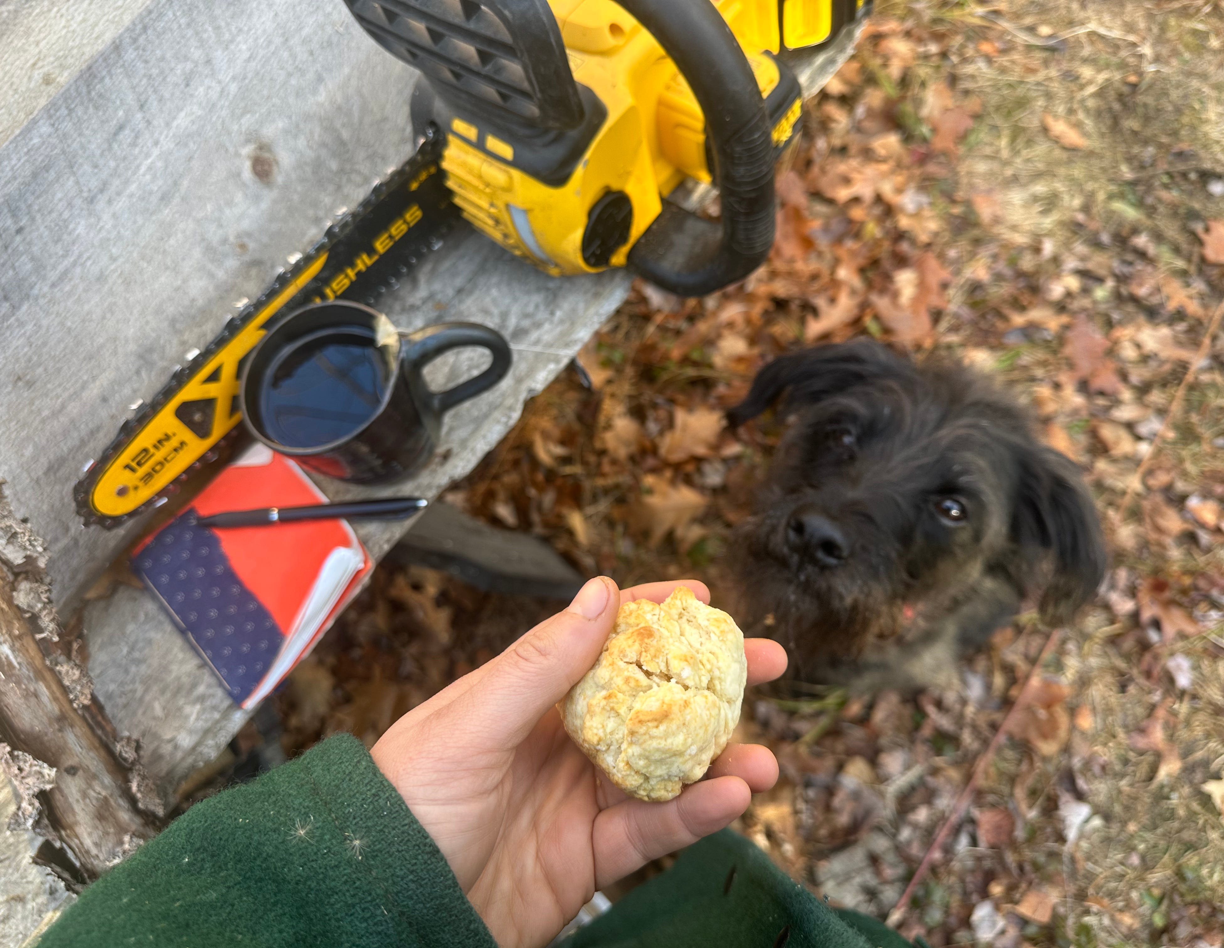 This, like most food memories that stick with us, is more about the sweet little moment than the food itself. The bear fat biscuit kept in the pocket while cutting firewood for the office, then a short break for tea and to write a few things in one of Gram’s little books, now stained with bear fat. Ravens playing chase. Sal got plenty of crumbs.