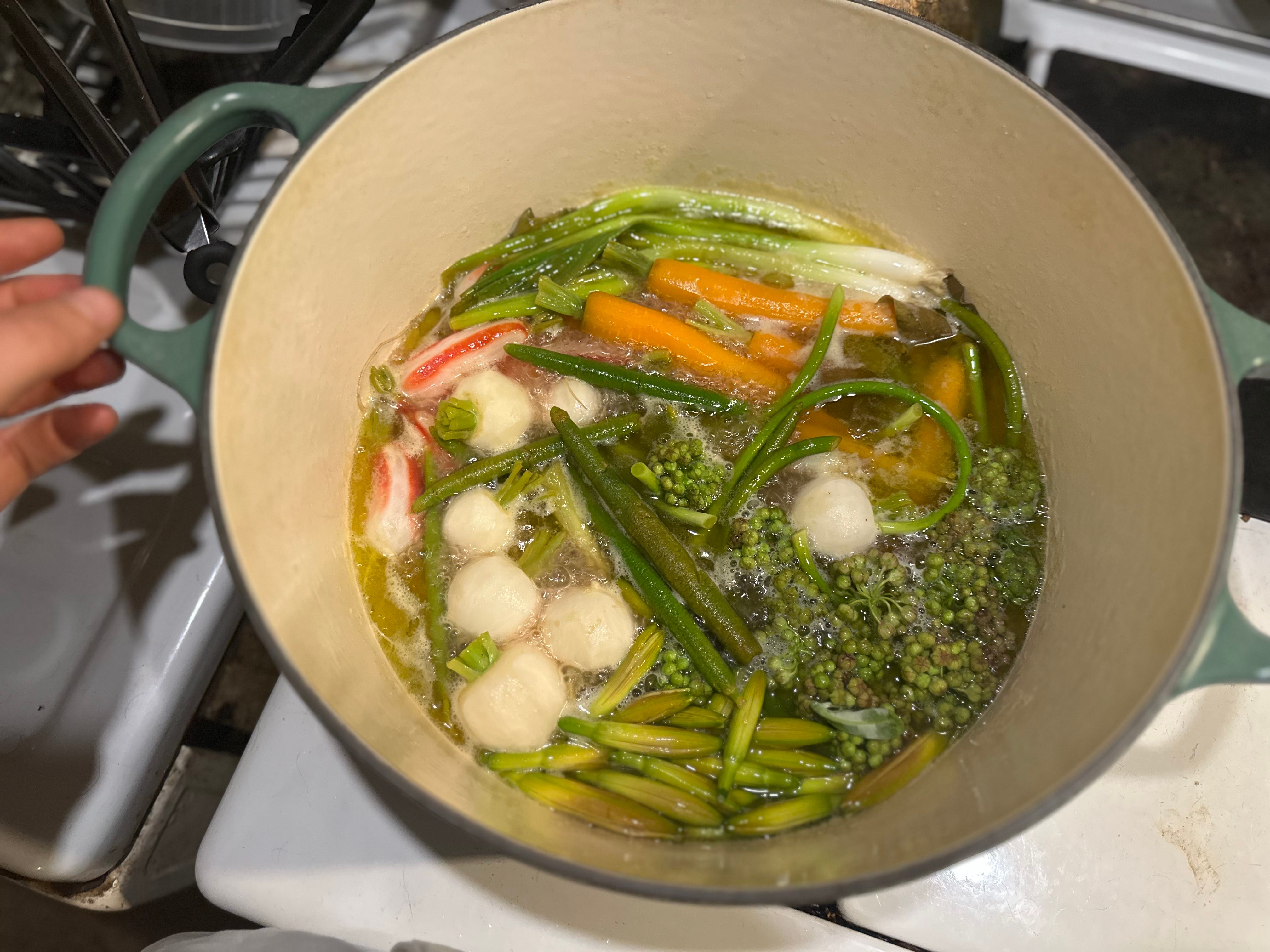 Poached baby vegetables (cattail spikes, milkweed buds, daylily buds, garlic scapes and garden veg) served with a creamy, herby, capery dip. Eaten with friends in the back of a boat, off the top of a cooler full of fish, out in the big Atlantic, on our way back from fishing Platts Bank. What a day.