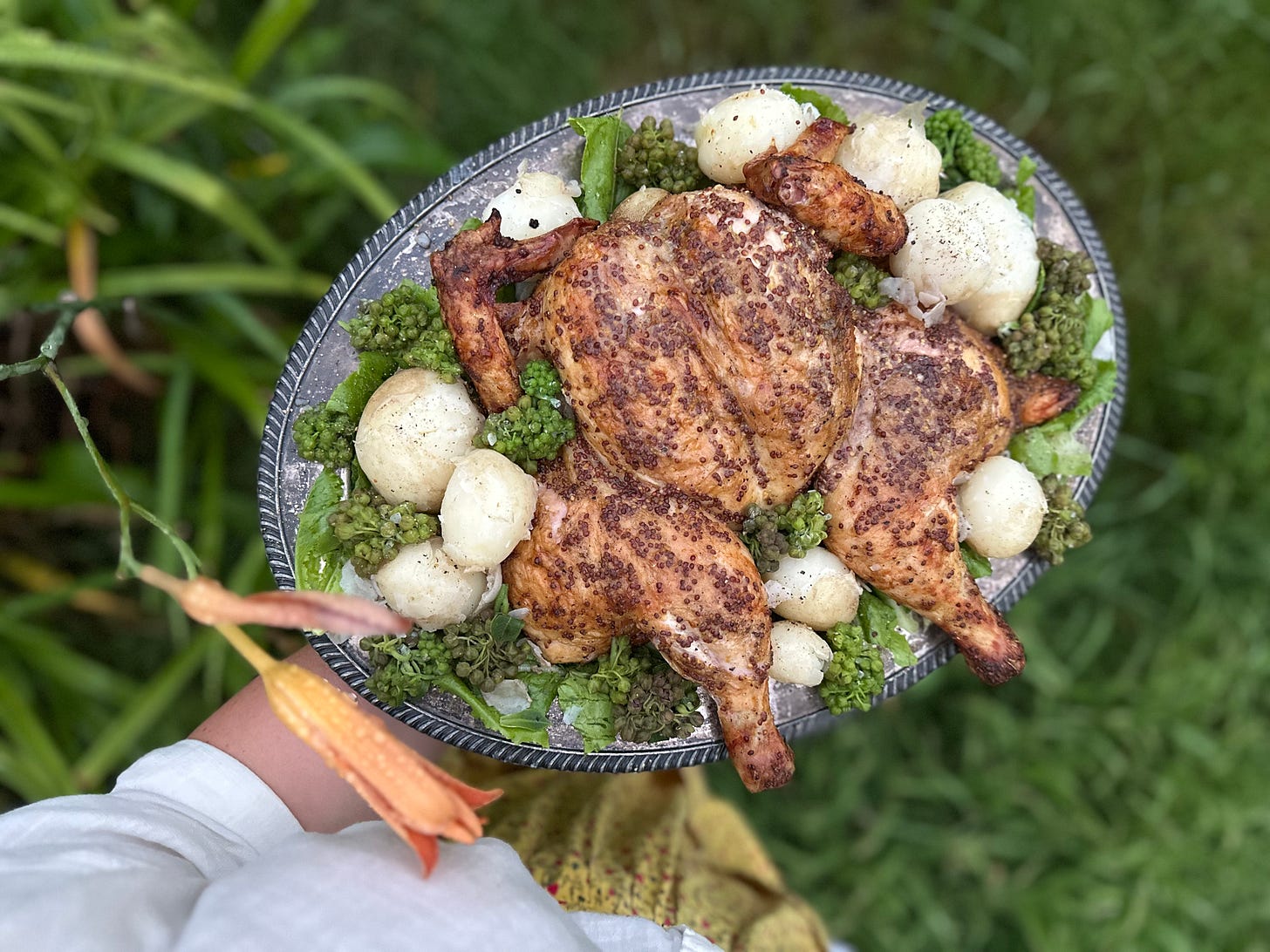 The memory of this grilled chicken with mustard sauce served over milkweed buds, new potatoes, and little lettuces, all dressed in warm bacon fat and apple scrap vinegar, holds still as a moment I savored in an otherwise feral blur of July.