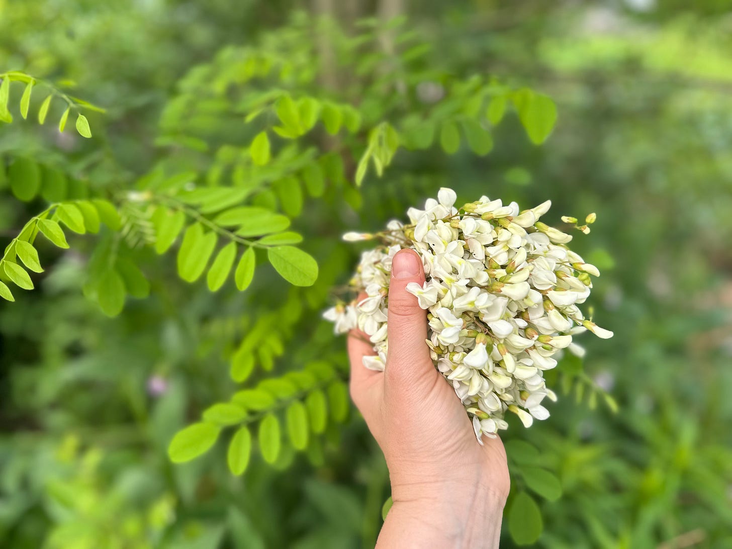 The weather, as almost always, was bullshit for harvesting Black locust blossoms. There was a brief window one afternoon when it wasn’t sheeting rain, or gusting wind, or scalding sun, and in that window I did grab a few handfuls that still had their perfume and snap. I ate most of them like popcorn, but also enjoyed some very much on a Salad Lyonnaise, where they just barely wilted under the warm dressing.