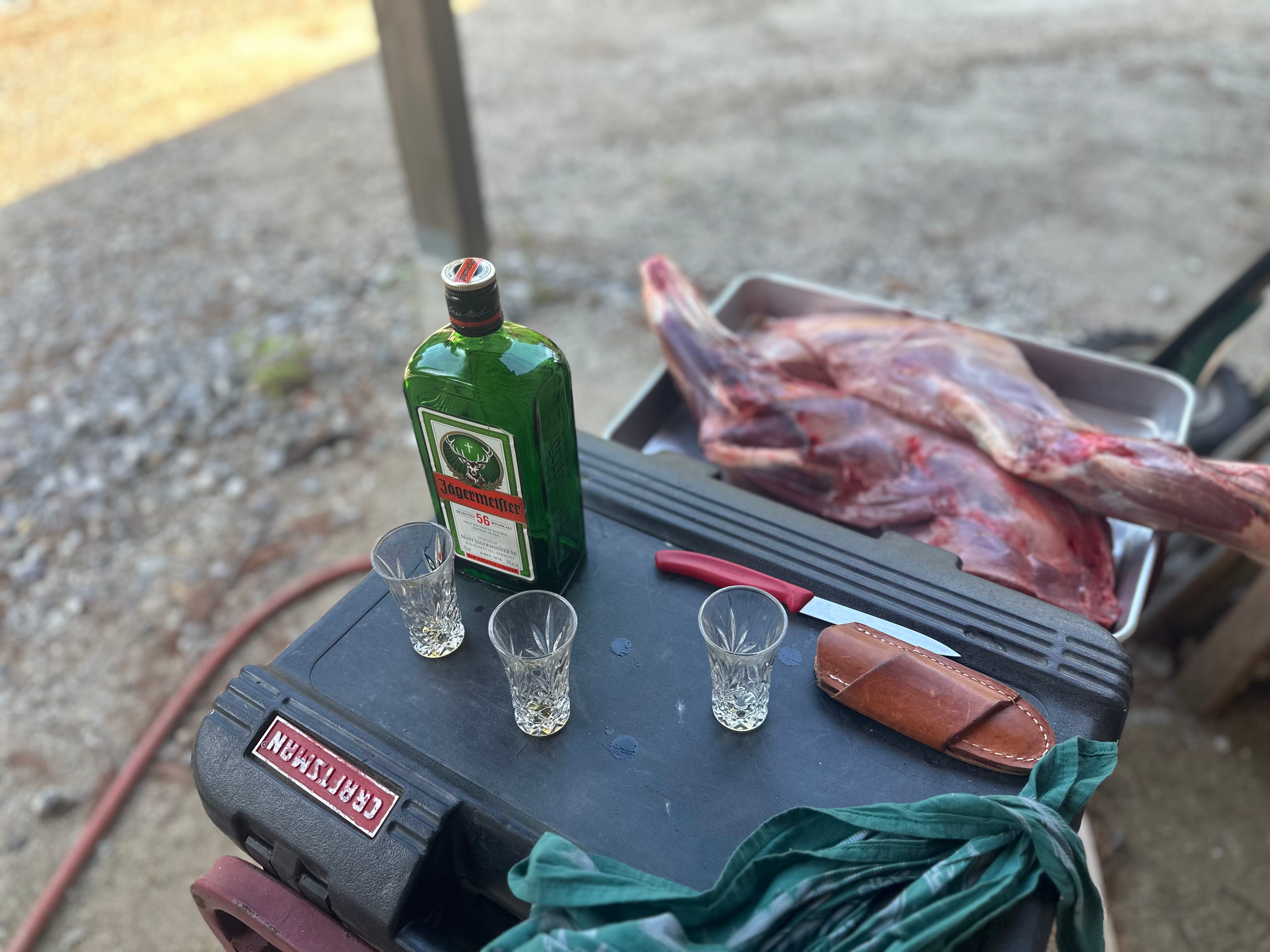 Three shots of Jaeger and a toast to Karen's first roadkill deer , the first deer I’d ever guided anyone through gutting and butchering, was a milestone moment for me.