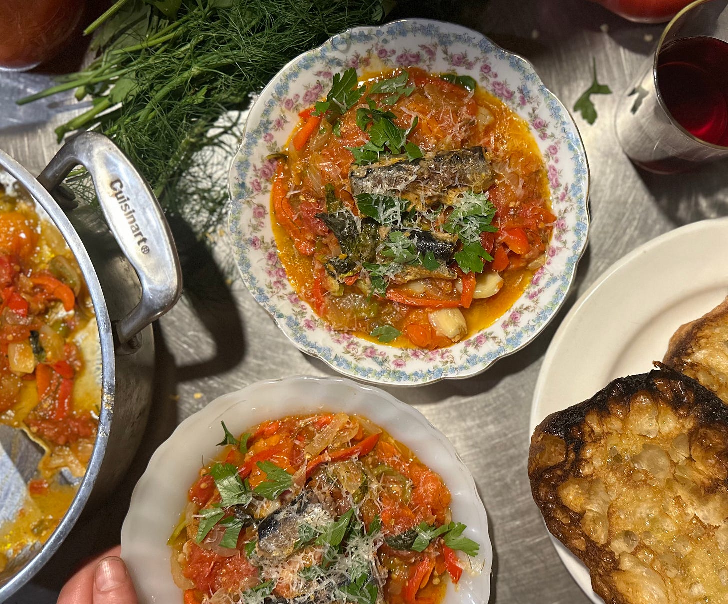 The San Marzanos were the bright red stars of the garden. Before we canned a million pounds of them, we stewed them nearly every day with the infinite melange of late summer vegetables and herbs - wild and garden, always a stem of kombu or handful of seaweed flakes, and whatever tin of fish and hard cheese we had on hand.