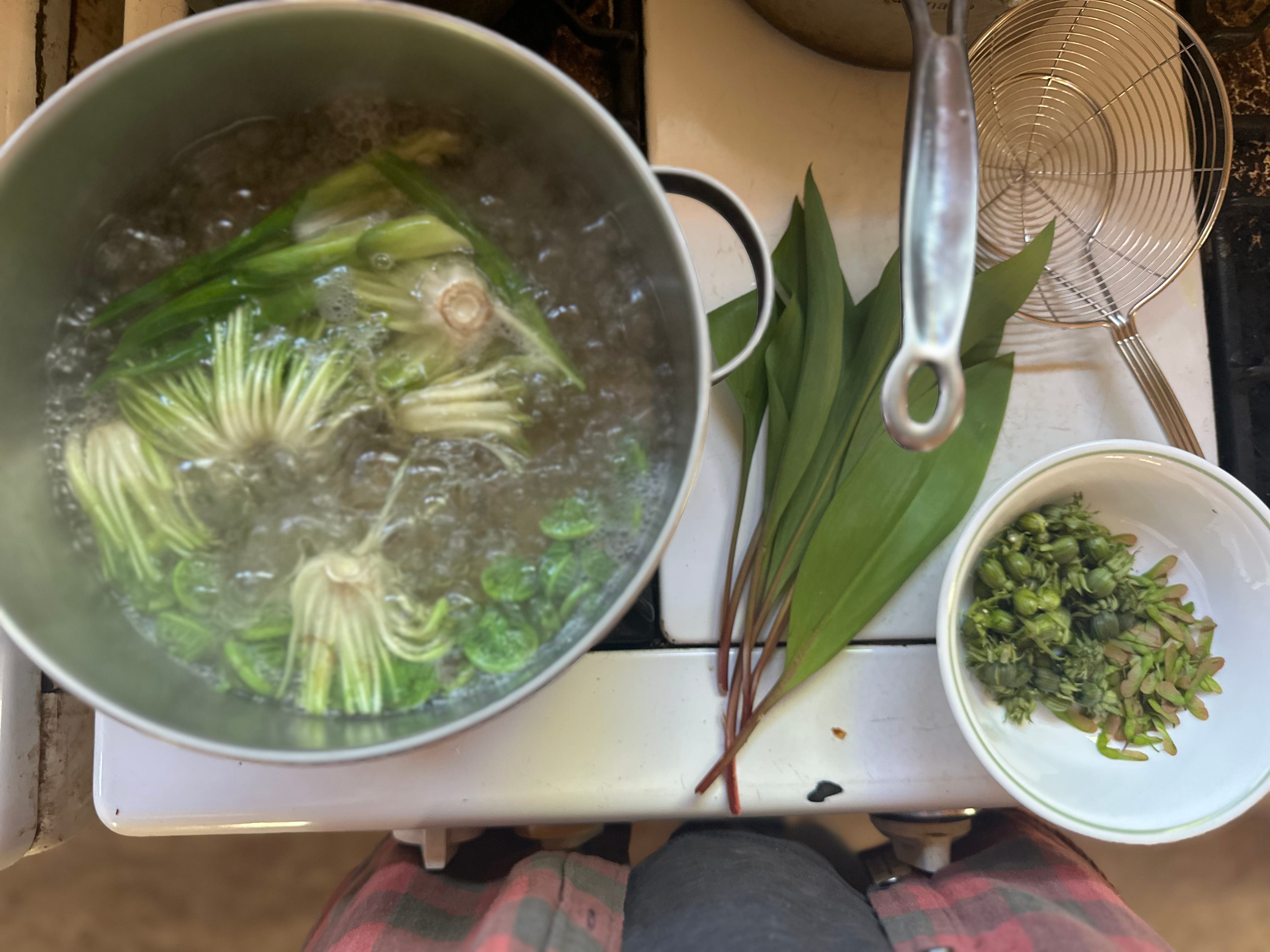In early spring, when everything was the greenest green, I picked a medley of tender things and blanched and marinated them. I made some ricotta and had a picnic with my Mom on Mother’s Day sitting in the spring sun amidst our family gravestones. Wild leeks, fiddleheads, dandelion crowns and buds, hosta shoots, maple keys and more went into a fragrant oil bath and were sopped with soft cheese and good bread along with buttery morel mushrooms and toasted dulse crushed over. Everyone was there. It was special.
