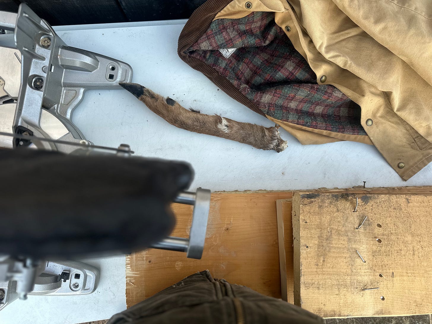 Still-life with chopsaw, grandfather’s barncoat, and a deer leg that Sal pulled out of a melting snowbank - set on an old chest freezer we keep saying we’re gonna sell but keep using as an outdoor table instead. As much as I try to class up my act, my aesthetic always ends up being something like this.