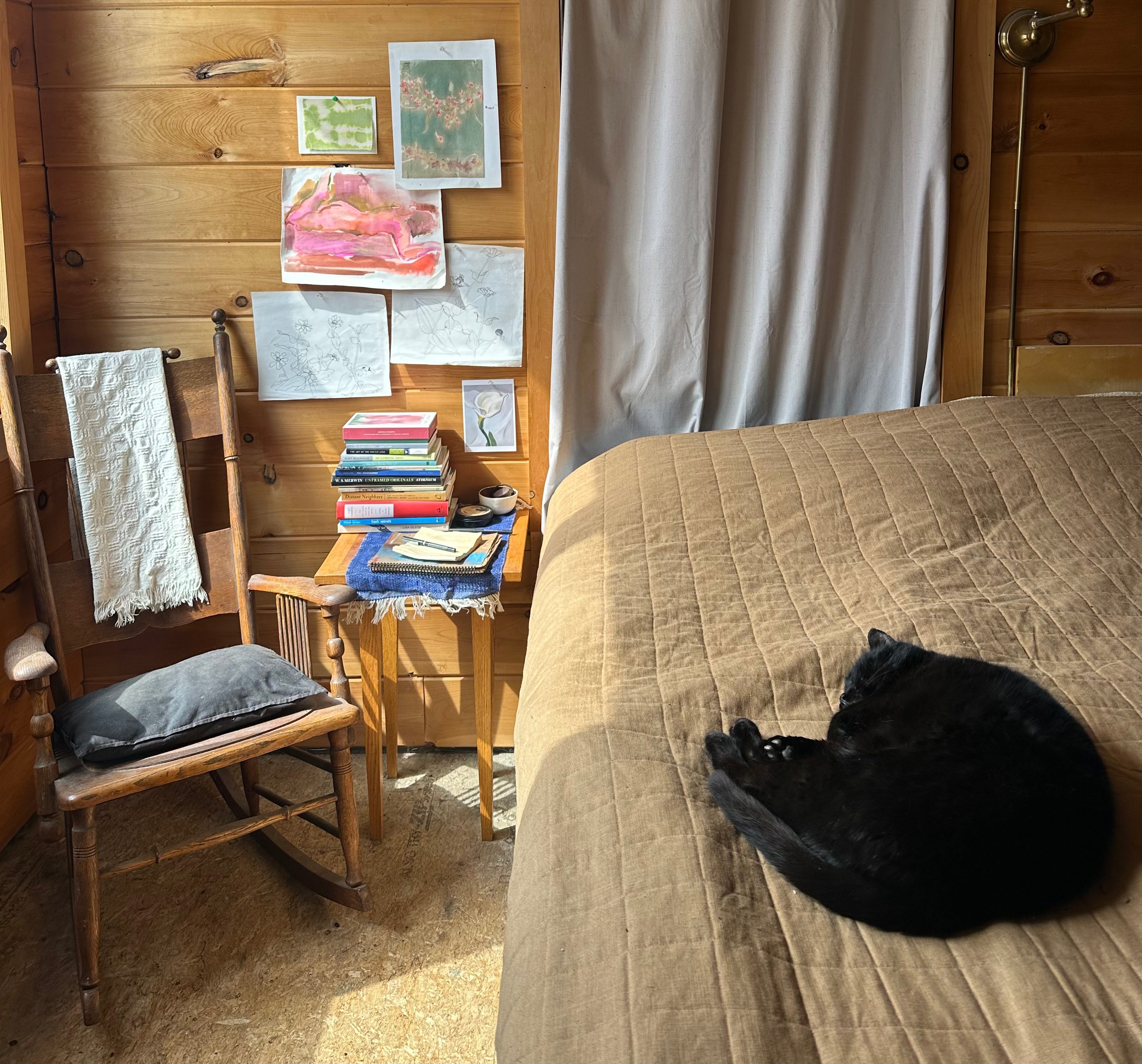 In deep-cleaning the bedroom to prepare for building stairs, I decided to try to make my bedside somewhere I want to spend time. My Uncle Greg made the table, my mom nursed her babies in the rocking chair and wove the towel draped on it, my gram made the pillow, journals, and sketches of zinnias, my other grandmother made the watercolors, my cousin Cynthia’s Circularity News made the ceramic bowl, and friends made the fabrics. We got a maple bedframe for free online but haven’t brought it up yet. I’d like to take down the insulated curtains and put up some blinds. I felt the same energy and satisfaction of a pre-teen girl rearranging her room and sticking stars on the ceiling. I’m sure the space will evolve, but it beats the laundry heap that preceded it. Oh, and this was Fish’s last day with the loft to himself before the stairs went up and the dogs invaded. Poor kitty.