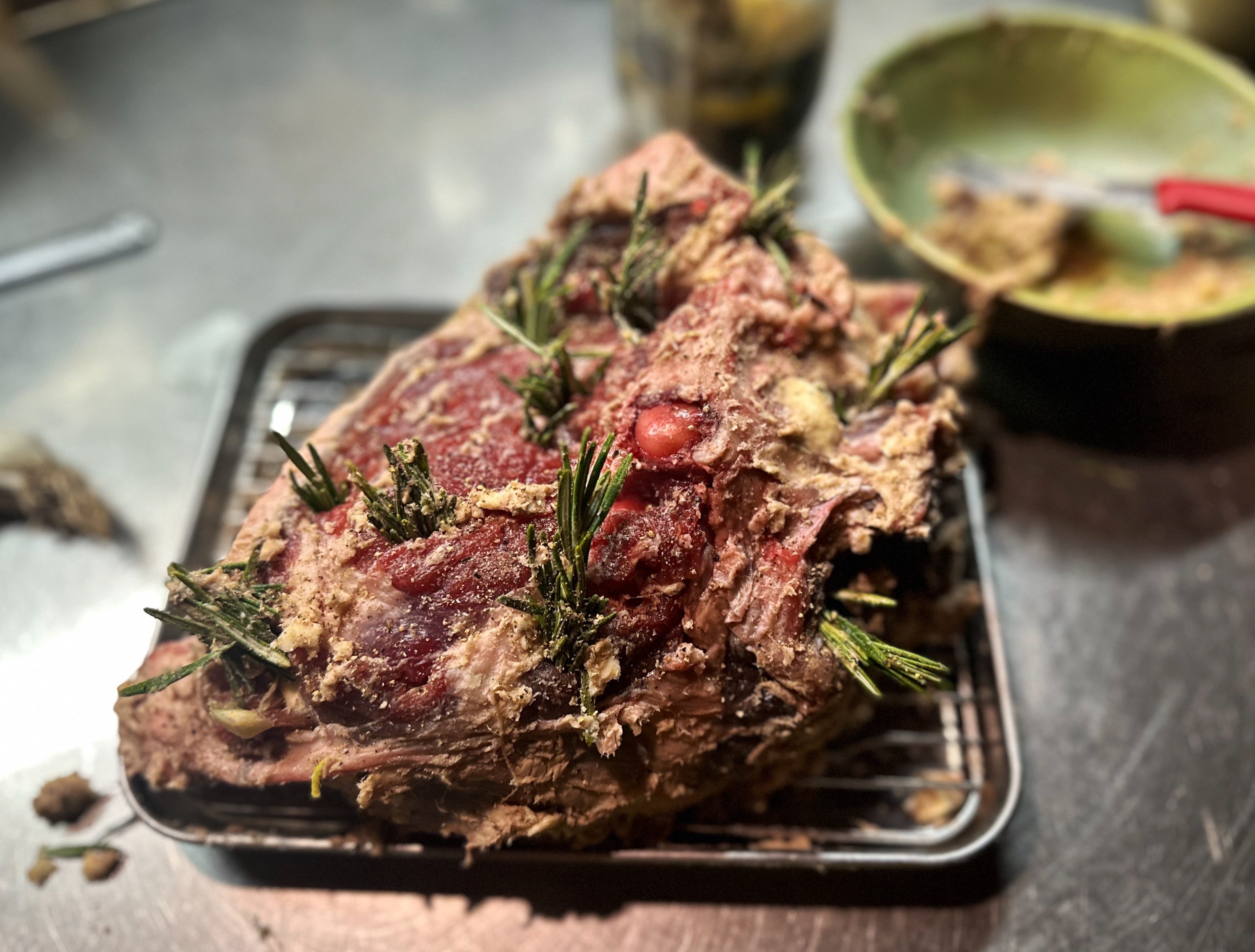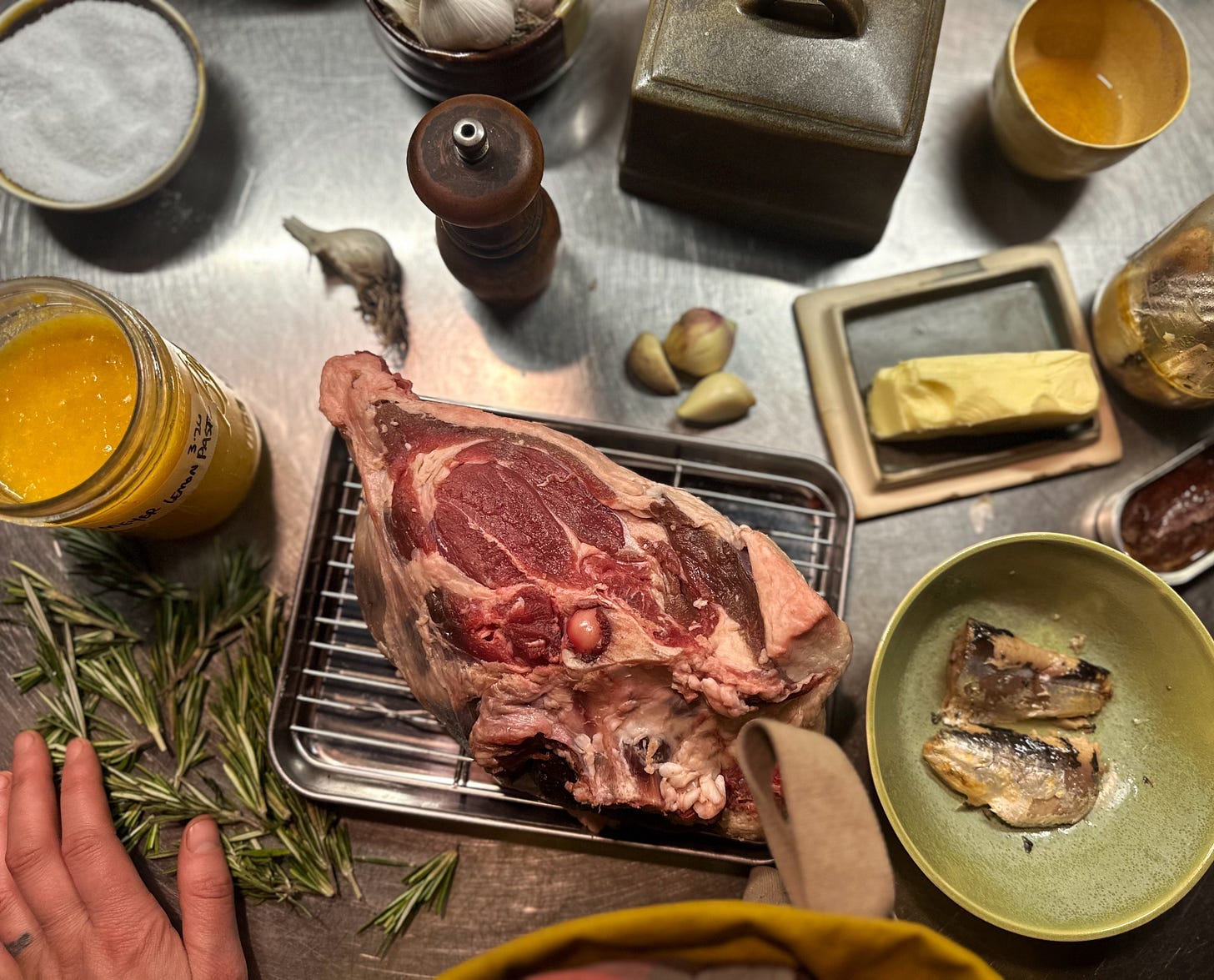 Another beautiful use of the Meyer lemon paste and the alewives was to mix them with softened butter and rub all over a mutton roast.