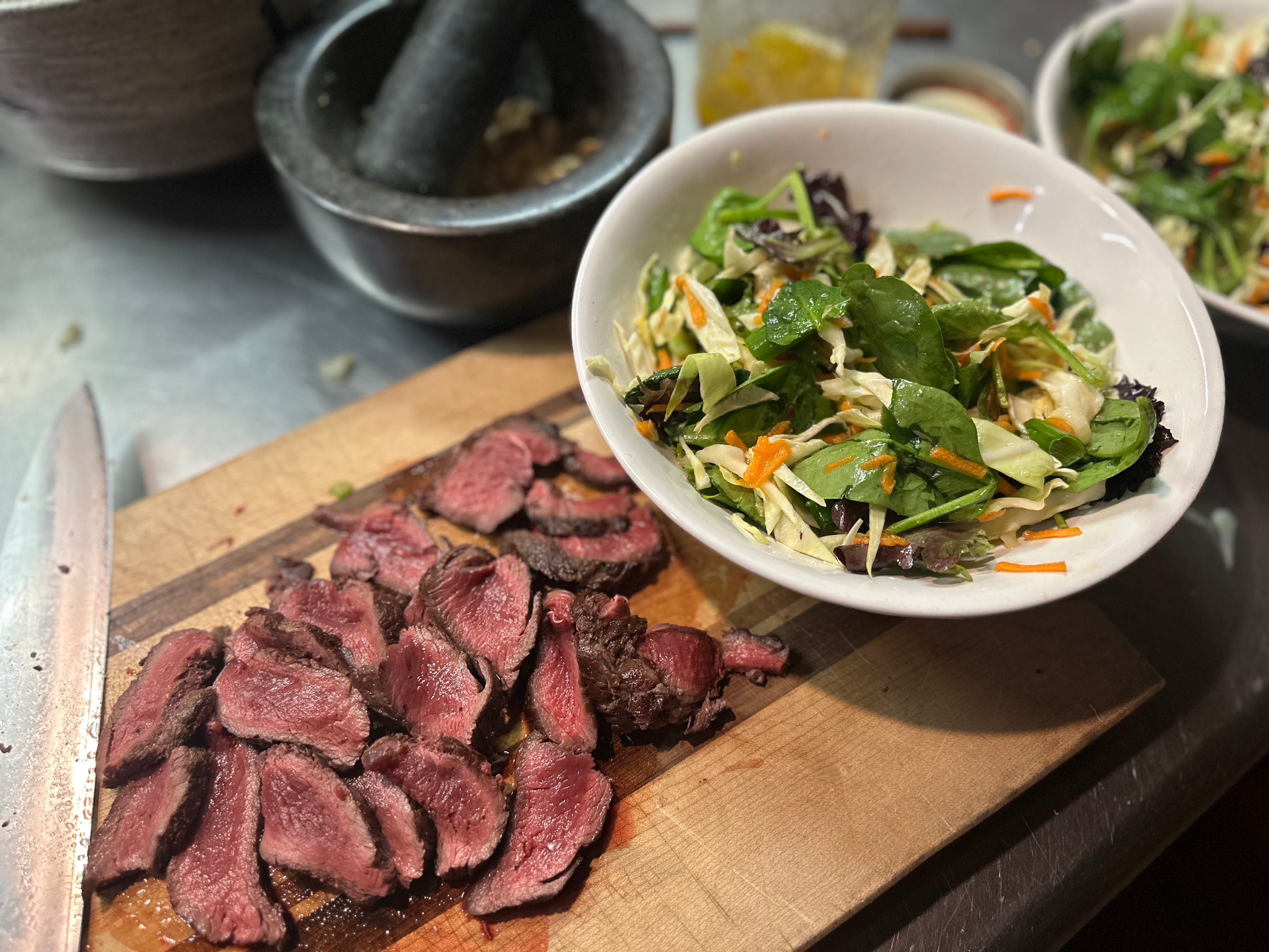 Along with the Ceasar salads, another dish that’s on heavy rotation on busy days is Thai beef salad with venison, either hunted or roadkilled. The storebought salad greens are rather bleak but we are nonetheless thankful for them in March in Maine. The dressing of fish sauce and lime juice and the flesh of the wild deer gives them life.