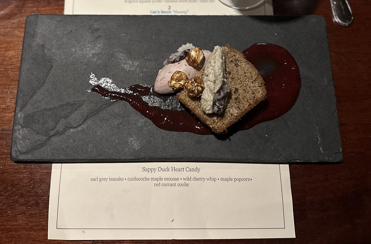 I haven’t been out to eat except for this treat of the annual beer and game dinner at Black Trumpet Bistro. My wild cherries were a dream dance with candied duck heart in this special dessert.
